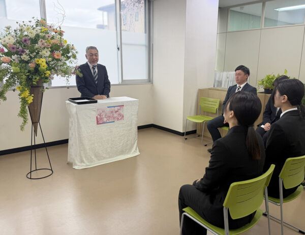 社長や先輩社員から御祝いの言葉を述べ、新入社員の皆さんは緊張した面持ちながらも希望に満ちた表情で式に臨んでいました。